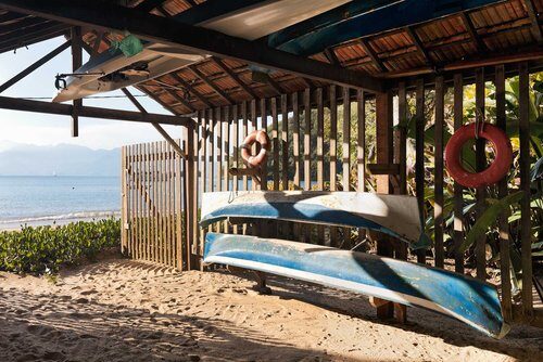 É o nosso espaço na praia do Abraãozinho. Chuveiro de água doce, deck com sombra, caiaques duplos, pranchas de stand up paddle te esperam.